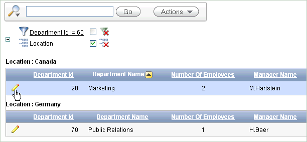 You already used the Select Column option from the Actions menu to add columns to the report display. In this section, you run the application and use some of the various search, sort, highlight and reset features to manipulate the Departments interactive report.
