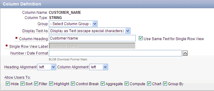 Use the check boxes under Allow Users To to control how users manipulate the report. Options include: Hide, Sort, Filter, Highlight, Control Break, Aggregate, Compute, Chart, and Group By.