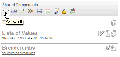 Clicking the Edit All icon displays pages that enable you to edit or delete multiple controls, components, or application logic simultaneously or view a history of recent changes.